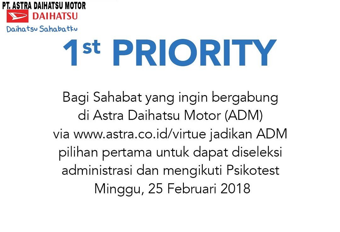 Psikotes Pt Astra Daihatsu Motor : Lulus Cek Duplikasi Pt Astra Daihatsu Motor Pdf : Lowongan kerja pt astra international tbk hingga 4 november 2016 &mldr.. Schnell & einfach preise vergleichen für motor daihatsu von geprüften onlineshops! Psikotes astra daihatsu motor 2018. Selain ijazah dan nilai yang menjadi syarat utamanya, kita juga wajib lolos dalam semua tes saat proses rekrutmen pt. Tahapan tes pt astra daihatsu motor, psikotes sampai tes kesehatan. Für gebrauchtes, generalüberholtes oder neues daihatsu austauschmotoren.